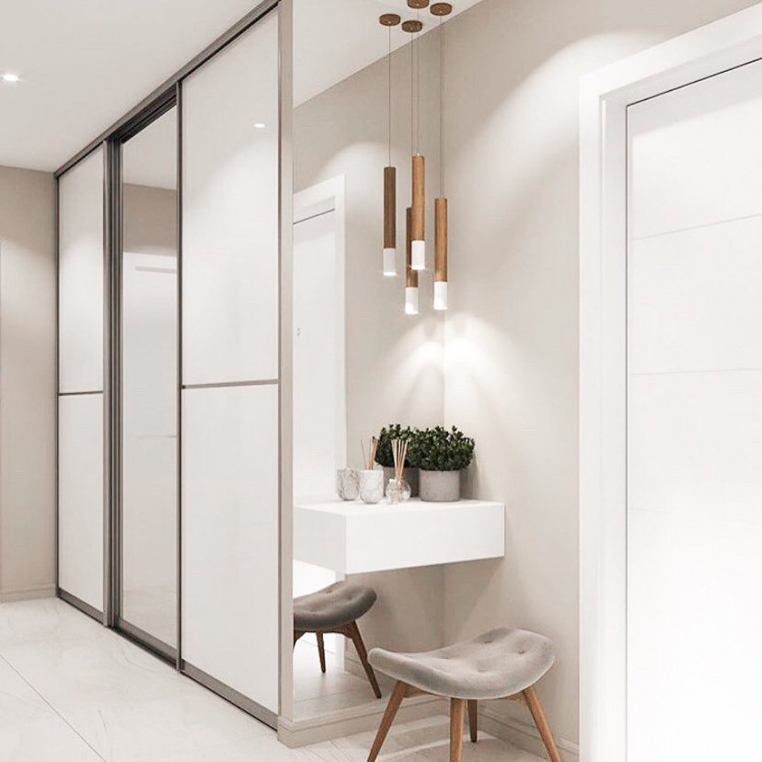 Если у вас широкий коридор, можно выбрать длинный прямой шкаф-купе до самого потолка. Такое решение позволит визуально расширить пространство стены, а светлые или зеркальные фасады придадут прихожей и коридору больший объем.